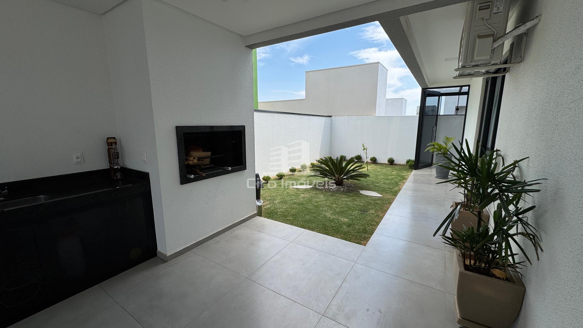 02 Vagas de garagem com área gourmet com churrasqueira e amplo balcão com pedra em mármore e portas de vidro.