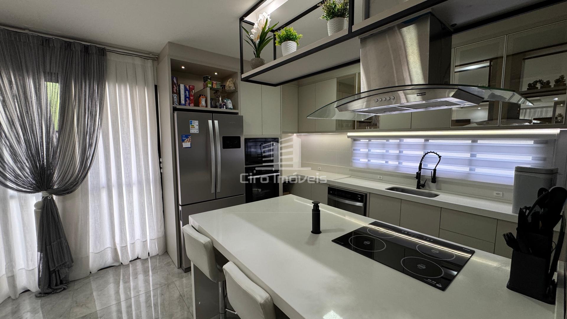 01 Cozinha com móveis planejados, forno elétrico, microondas, fogão de indução e coifa balcão e ilha de pedra branca.