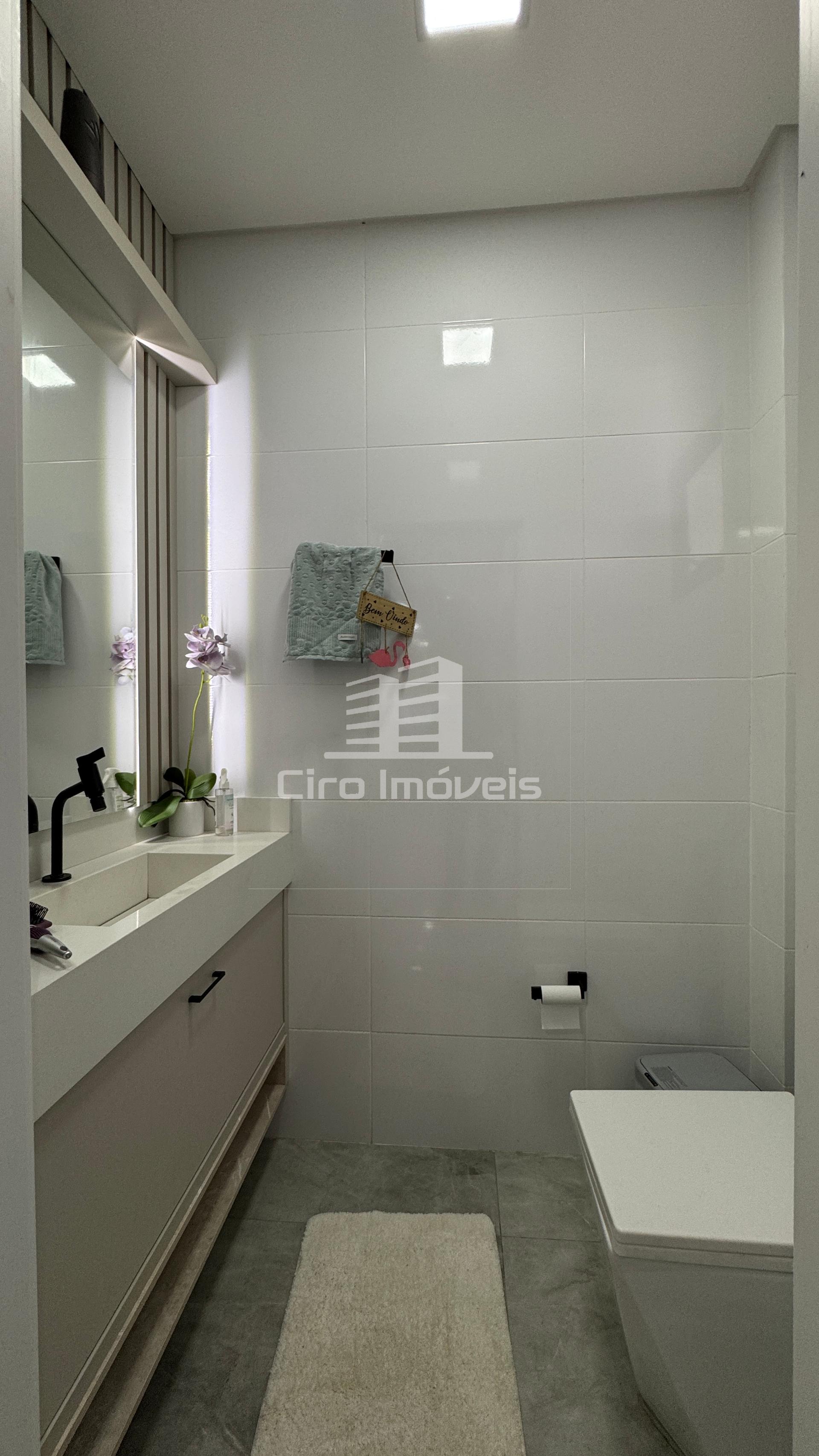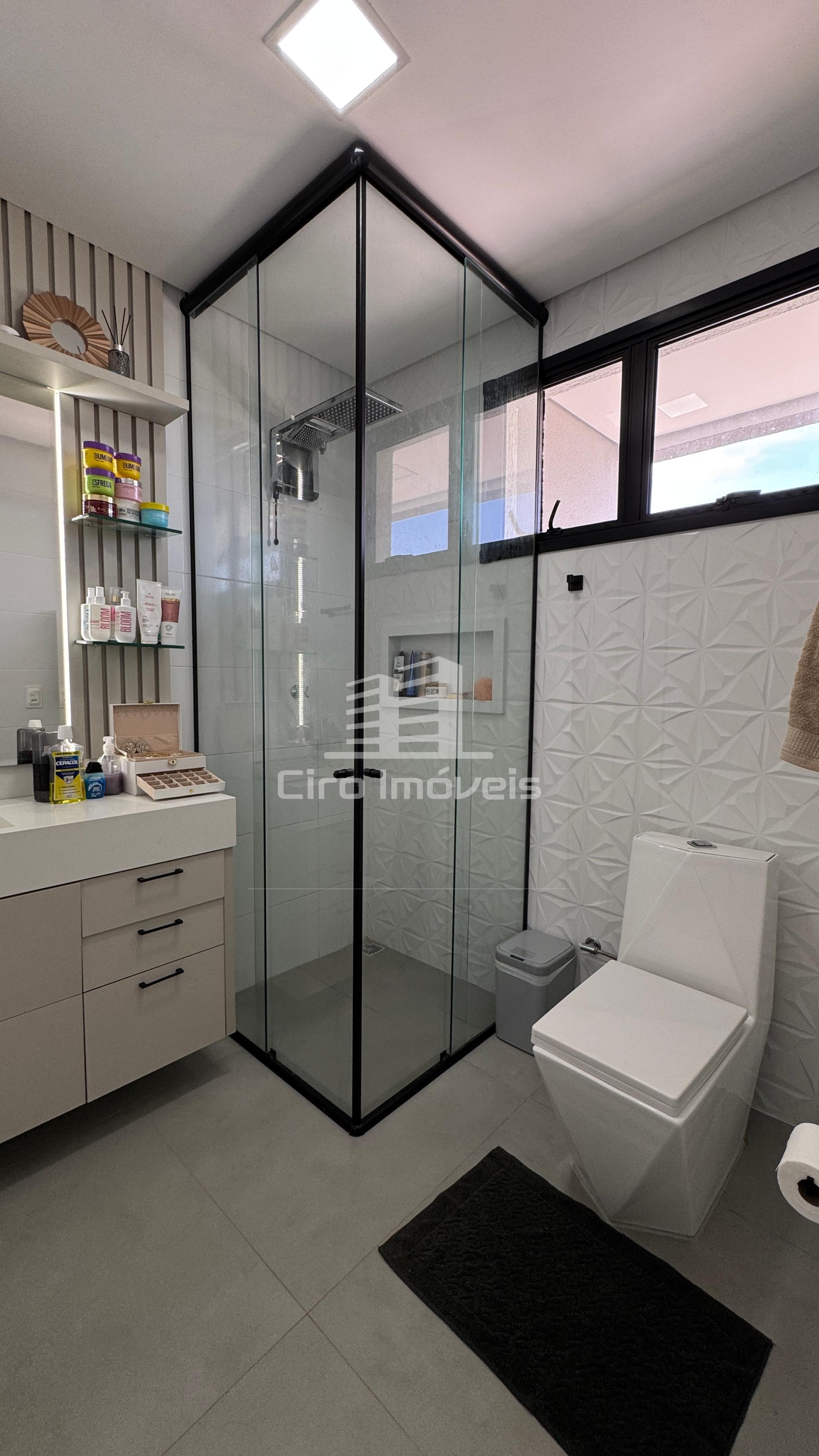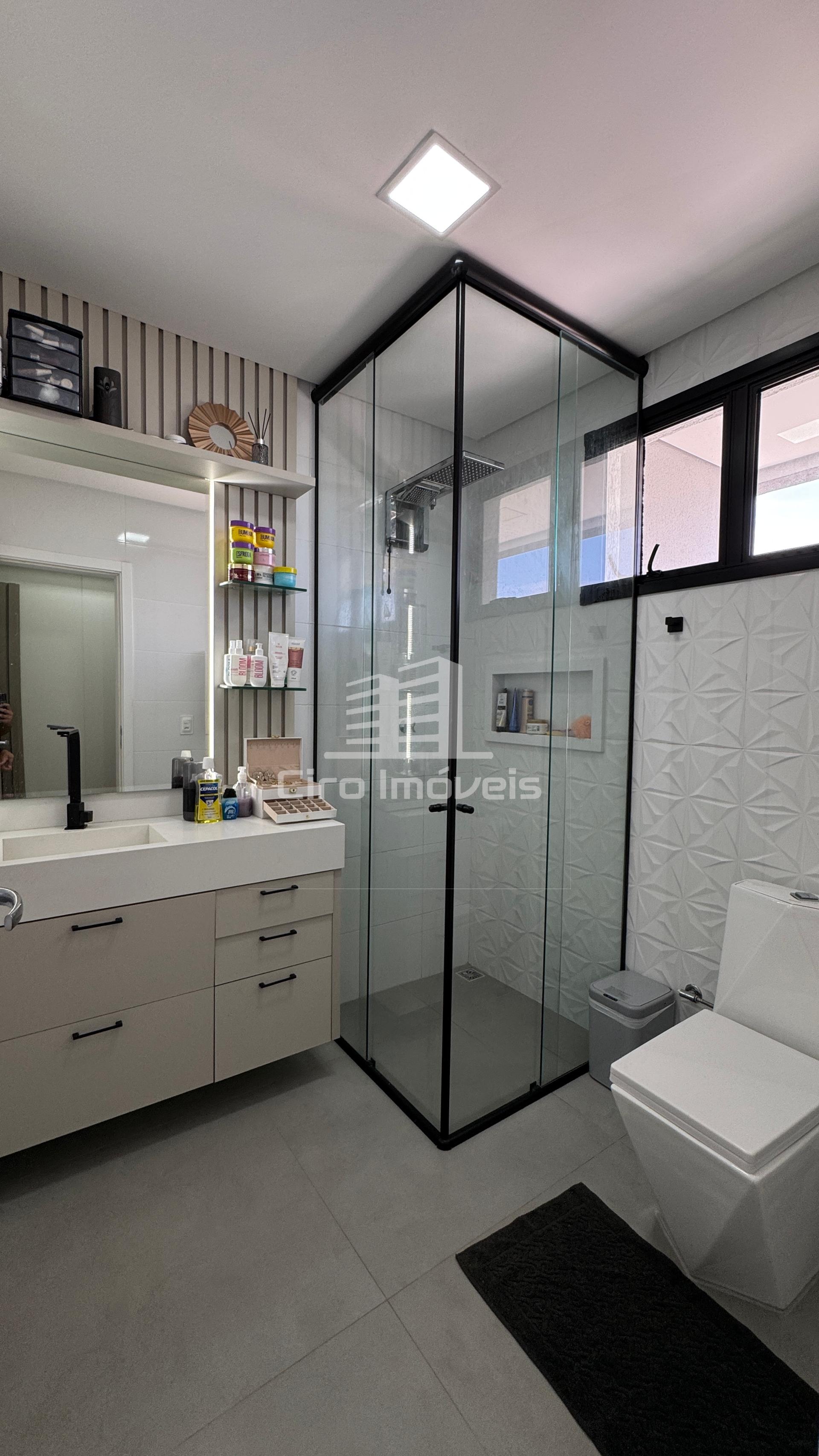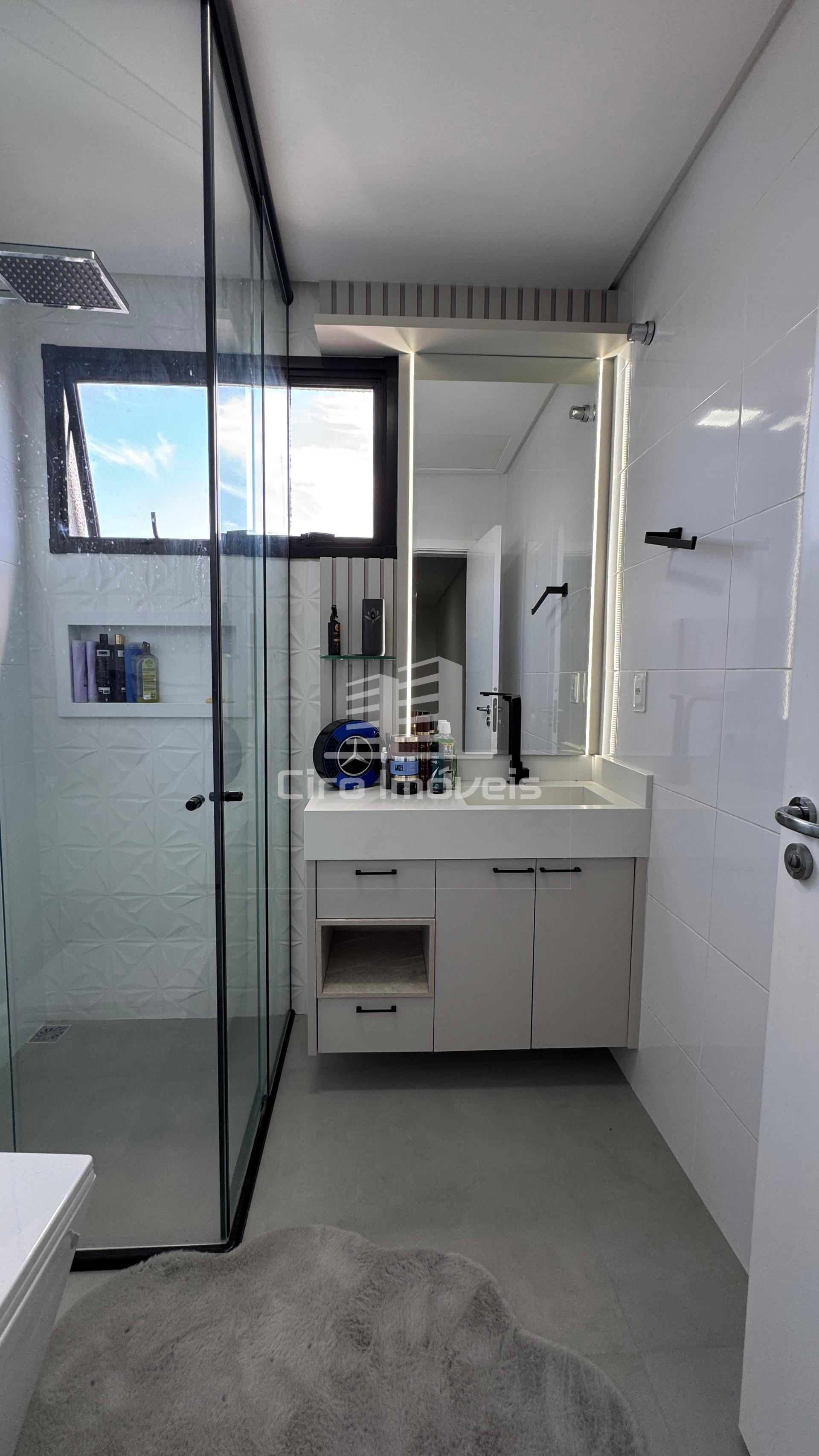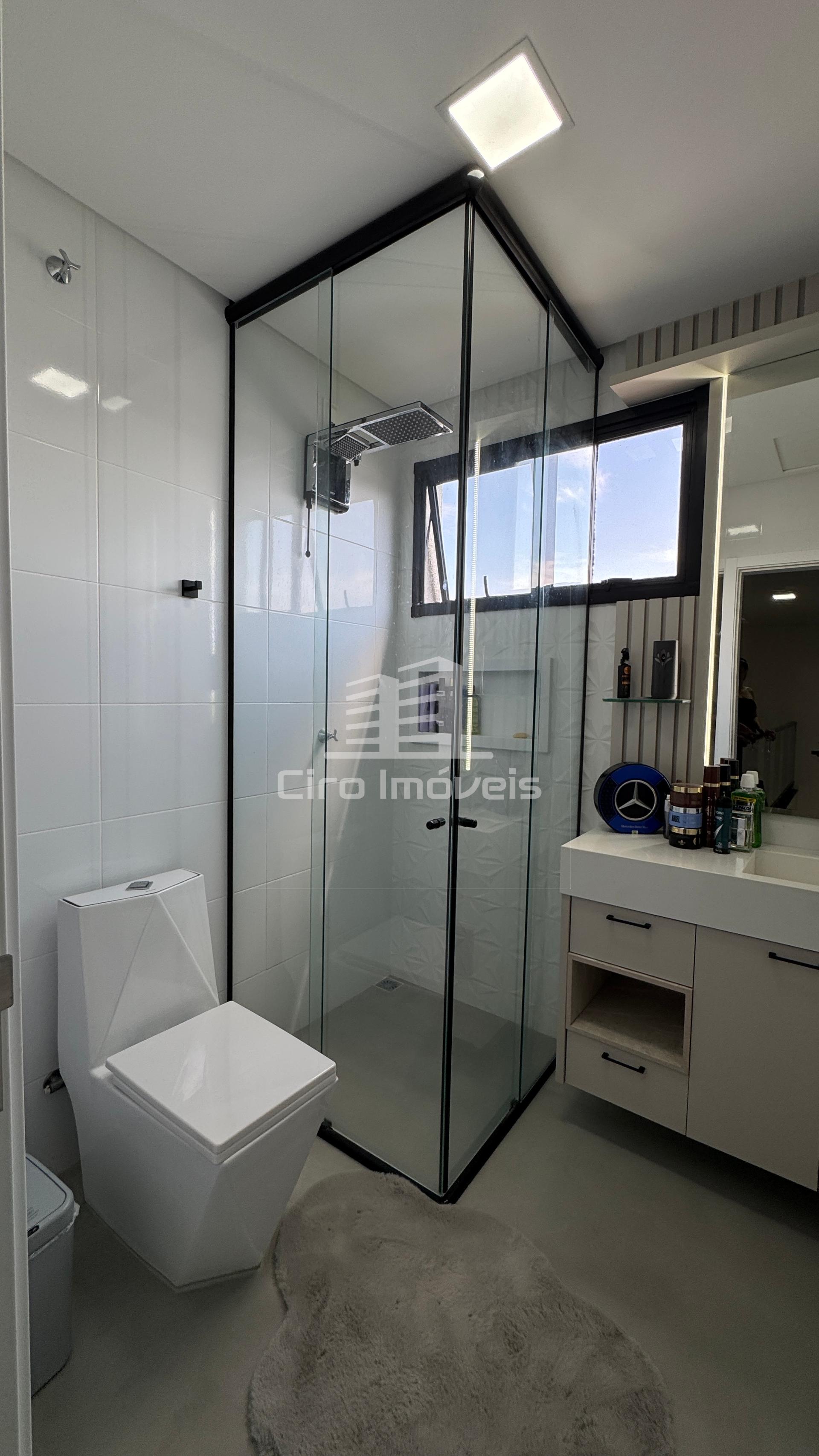 01 Banheiro social; boxe de vidro até o teto e balcão planejado com pedra, espelho e led;