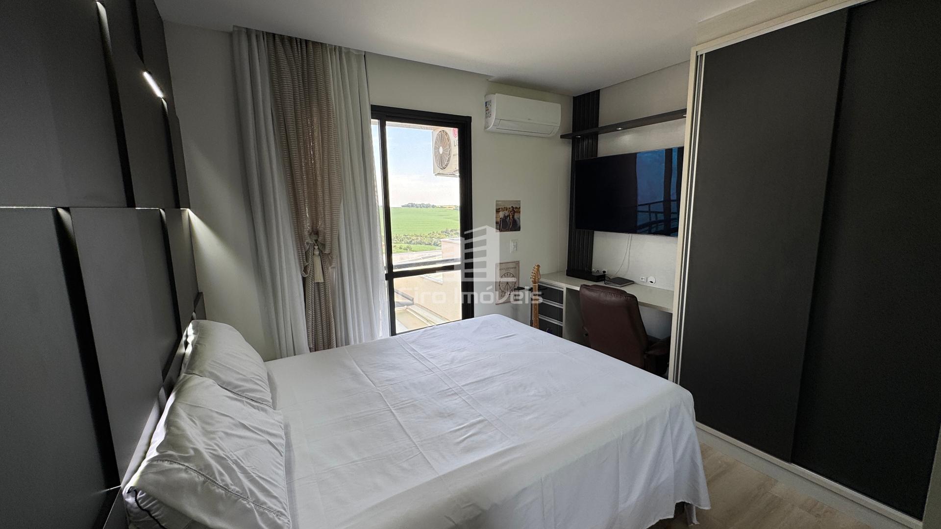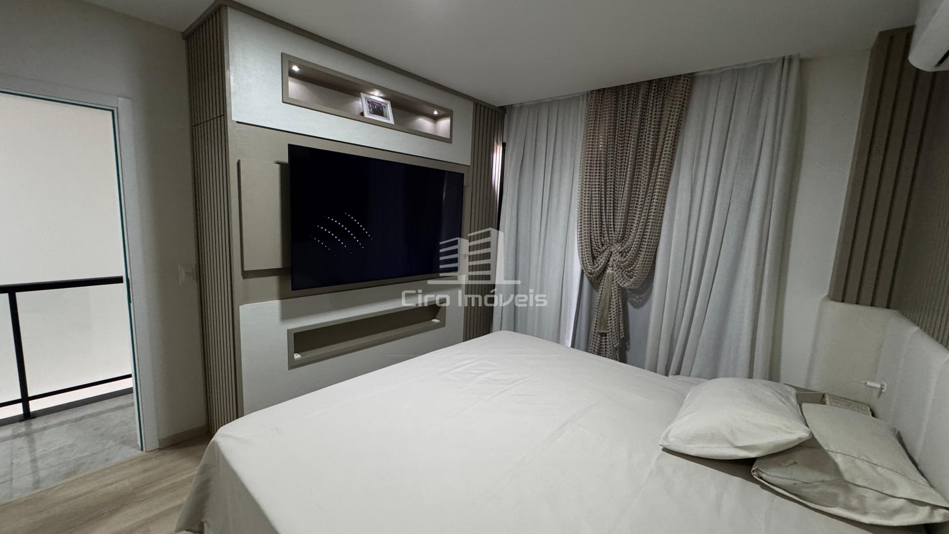 01 Suíte com closet e móveis planejados com acesso a um amplo terraço, boxe de vidro até o teto e balcão planejado com pedra, espelho e led;